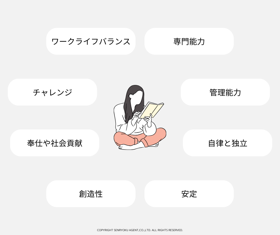 (4)安定: 安定した雇用や収入、福利厚生などを重視し、リスクを避けることを好む。