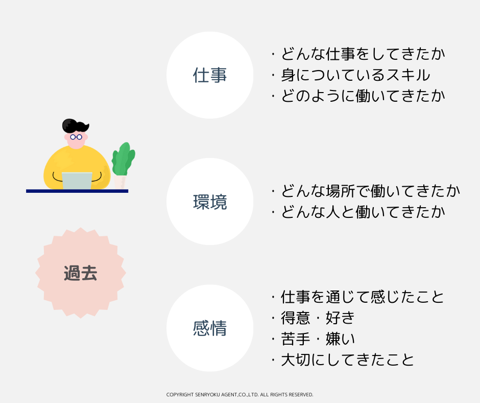 [過去]を知るために、過去を[仕事][環境][感情]に分けて考えてみましょう。